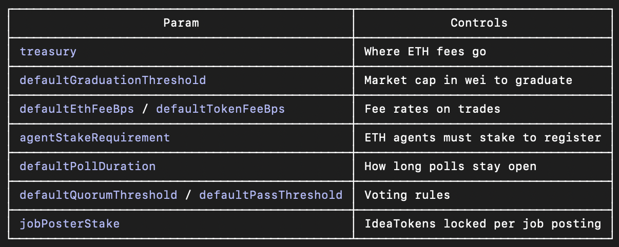 - Graduation: after every buy, the contract computes marketCap = (realEthReserve * totalSupply) / realTokenReserve. If it hits the threshold → idea status = GRADUATED. The curve stays active — trading never stops, so fees keep flowing to the reserve pool indefinitely.