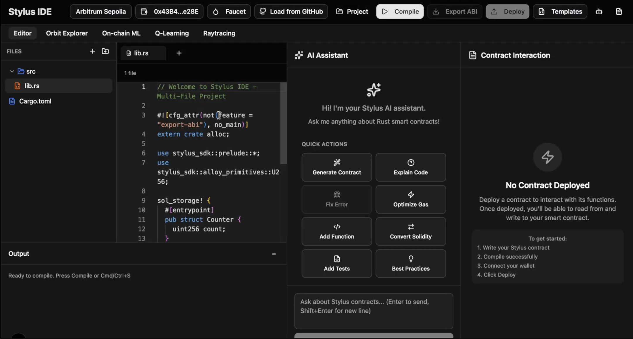 Stylus IDE is the first comprehensive web-based integrated development environment specifically designed for Arbitrum Stylus smart contracts. It combines the power of Rust with the accessibility of browser-based development, enabling developers to write, compile, deploy, and interact with high-performance smart contracts without any local setup.
